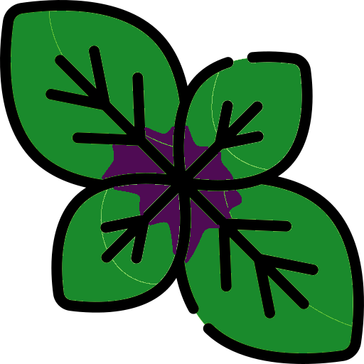 Basilic buissonnant aux délicates feuilles vertes, ponctuées à leurs bases d'un violet profond.